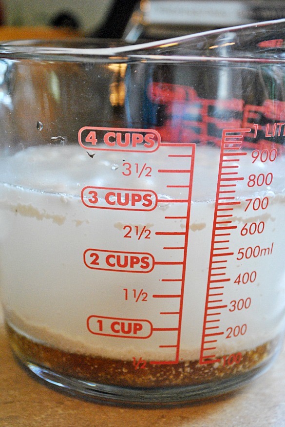 Drizzle the honey over the yeast until the water level reaches the 3 cup mark (a cheat to measuring the honey without the hassle of measuring it in a separate cup). This will gently push the yeast below the water, aiding in its activation.
